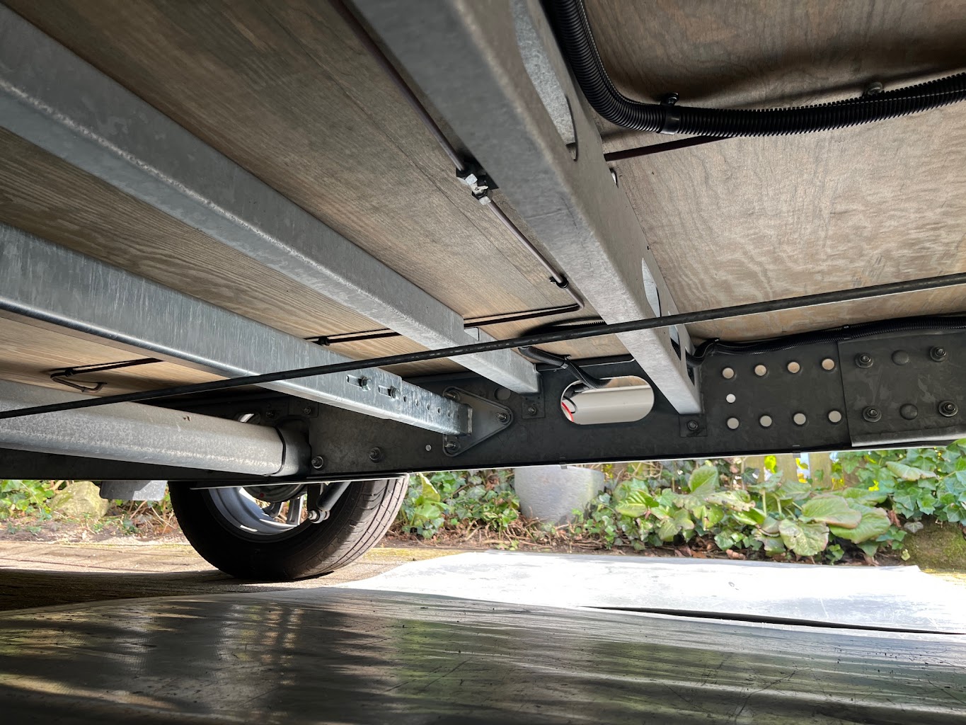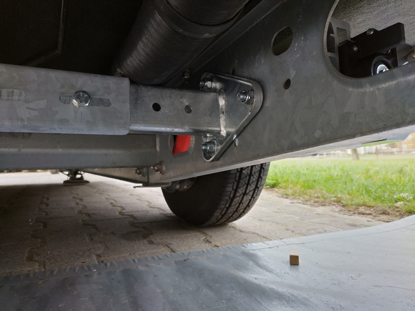 Werkstatt, aber keine Hebebühne oder Grube zur Verfügung so dass ich den Wohnwagen (Knaus Sport&Fun Bj. 2016) auf ca. 20 cm hohe Rampen gefahren habe und ihn vorne