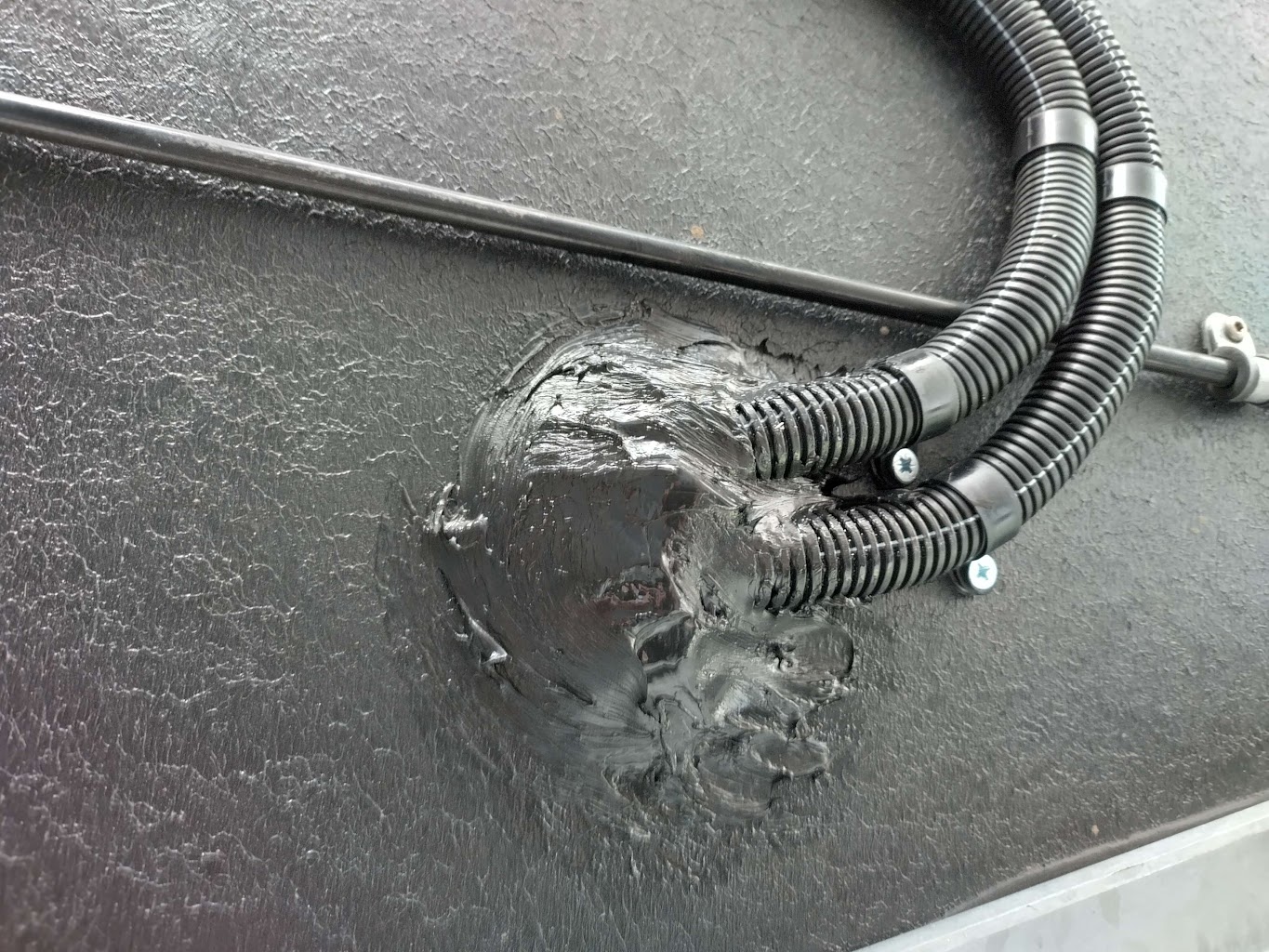 Wir legen grossen Wert auf eine saubere und vollstaendige Installation. Deshalb verlegen wir die Motorkabel standardmaessig in voller Laenge in einem flexiblen Schlauch unter dem Wohnwagen. Der Hersteller liefert lediglich ein kurzes Stueck Flexrohr mit um die Kabel durch das Chassis zu fuehren. Die verbleibende Laenge ist dann ungeschuetzt.