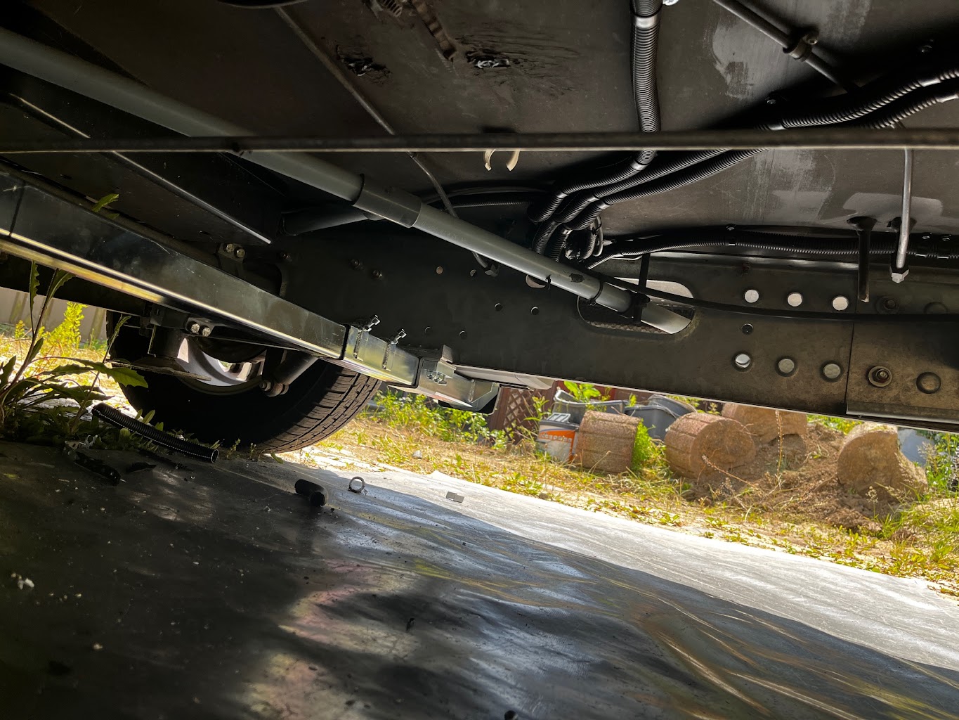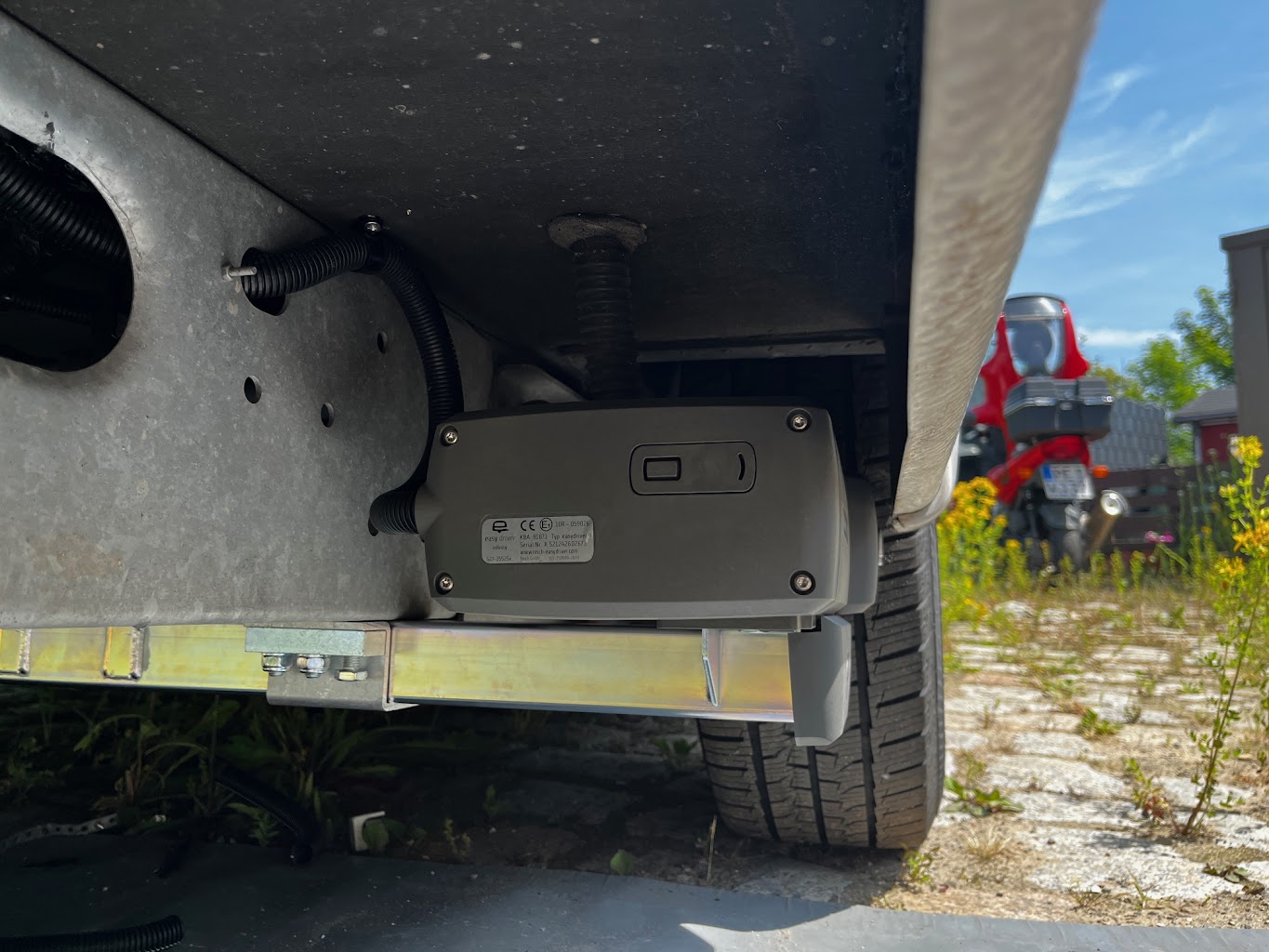 Die Motorkabel sind durch einen flexiblen, schlagfesten Schlauch geschützt. Dieser Schlauch wird mit Haltern unter den Wohnwagen geschraubt. Die Kabel werden durch 2 Löcher im Boden durchgeführt. Die Löcher werden komplett mit Dichtmasse abgedichtet.